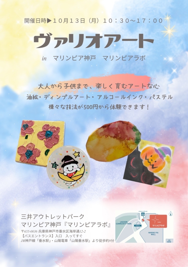 大人から子どもまで楽しく育むアートな心、油絵、ディンプルアート、アルコールインク、パステル等様々な技法が500円から体験できます!