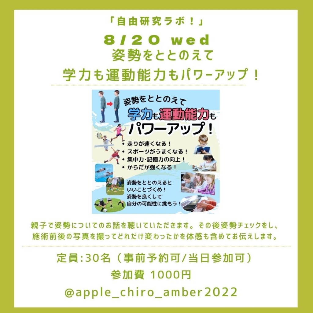 親子で姿勢についてのお話を聴いていただきます。その後姿勢チェックをし、施術前後の写真を撮ってどれだけ変わったかを体感も含めてお伝えします。