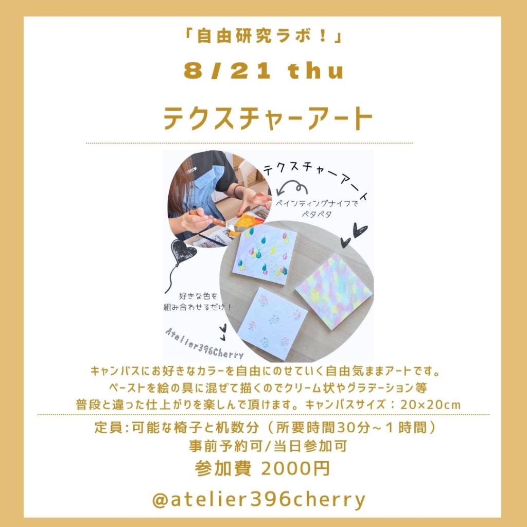 キャンバスにお好きなカラーを自由にのせていく自由気ままアートです。ペーストを絵の具に混ぜて描くのでクリーム状やグラデーション等、普段と違った仕上がりを楽しんで頂けます。キャンパスサイズ:20×20cm