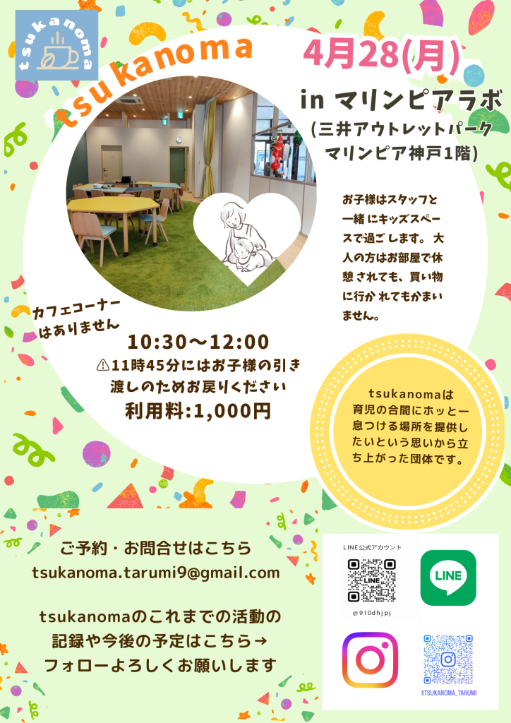 「マリンピアラボにて、お子様を複数のお母さんスタッフで見守り致します!わずかですが、マリンピアラボのお部屋の中でも、お外でも(館内)大人お1人の時間をお楽しみください」