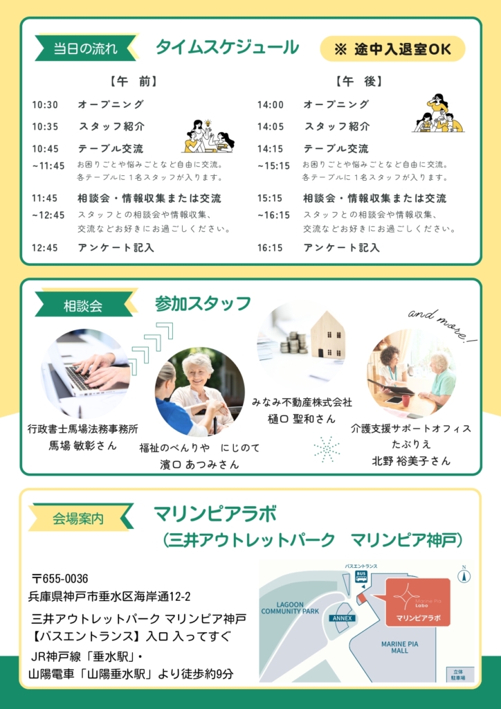 みなさまが日頃抱えておられる介護のお困りごとやお悩みを、参加者や専門家と交流しながらお話してみませんか?具体的なお困りごとがある方は、相談会で一対一で専門家にご相談できます。