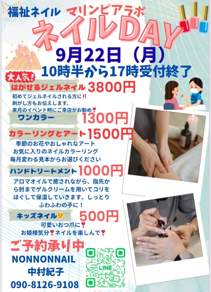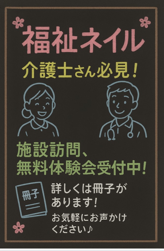 お子さんから高齢者まで幅広くネイルを楽しんで頂きたいです。ネイルケアも大好評です!縦筋、よく欠けるお悩みはありませんか?また、介護士さん必見パンフレットをご用意しております。ネイルサロンへ出向くことができない方への出張ネイル、施設訪問ネイルのご案内をさせていただいております。お気軽にお声掛けください♪