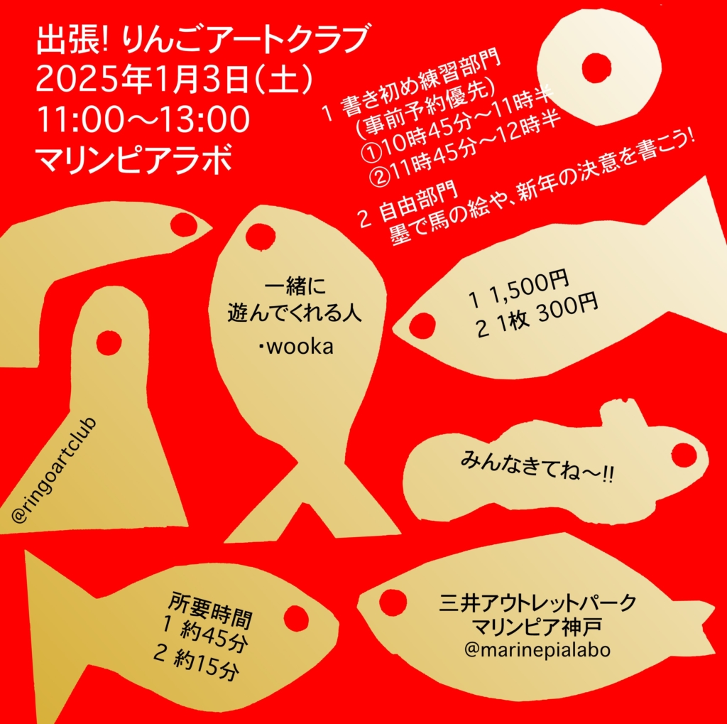 垂水区・星陵台にアトリエを構えるりんごアートクラブ @ringoartclub が、マリンピアラボへ出張!2026年、三が日の予定はお決まりですか?マリンピアラボでは、お正月らしいアートなひと時をお楽しみいただける、書き初めワークショップを開催します!子供達だけでなく大人の方も参加OK!干支など描きたい絵柄や新年の決意を考えて、遊びに来てくださいね。お待ちしています!