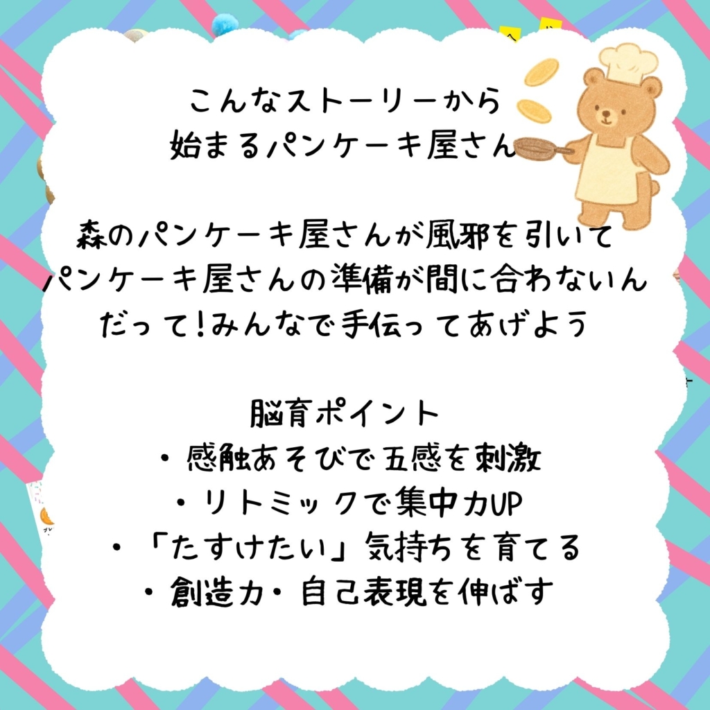 森のパンケーキ屋さんが、風邪をひいて困ってるよ!みんなで助けてあげよう♪ストーリー仕立てのリトミックから始まるお仕事体験!お仕事をしたら給料がもらえるよ♪作ったらパンケーキグッズは持って帰れます♪(※食べられません)おうちでも遊びが続く♪にじいろひみつきちへぜひお越しくださいね♪