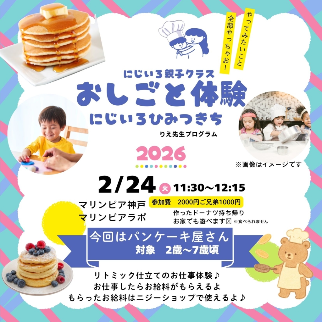 森のパンケーキ屋さんが、風邪をひいて困ってるよ!みんなで助けてあげよう♪ストーリー仕立てのリトミックから始まるお仕事体験!お仕事をしたら給料がもらえるよ♪作ったらパンケーキグッズは持って帰れます♪(※食べられません)おうちでも遊びが続く♪にじいろひみつきちへぜひお越しくださいね♪