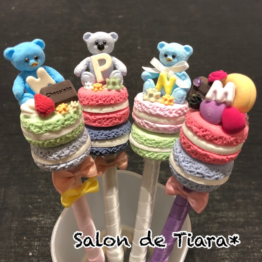 ①クレイ粘土で作ったマカロンを2色選んで、キラキラパーツやリボンを可愛くデコって自分だけのオリジナルのペンをお作りいただきます。