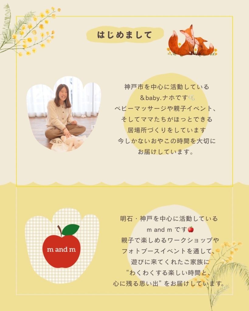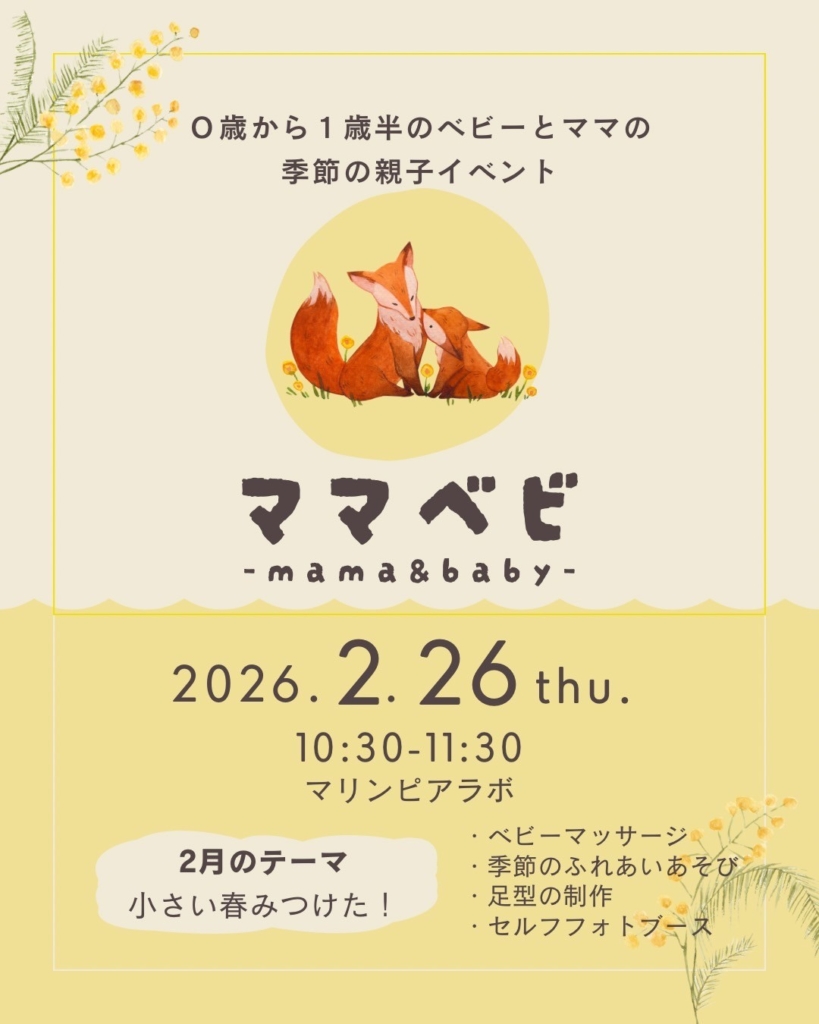 『ママベビ』0歳〜1歳半対象ベビマ×製作×セルフフォトブースで季節の思い出づくりイベントです。親子で季節を感じながら、今しかないこの時間を“思い出”という形で残していけたら…そんな想いでお届けする親子イベントです。赤ちゃんの成長は本当にあっという間。気づけば形に残せないまま過ぎてしまうこともありますよね。でも、ここに来れば大丈夫。無理なく、楽しく、毎月親子の思い出がやさしく積み重なっていきます。みなさまのご参加、心よりお待ちしています。